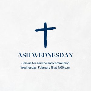 Ash Wednesday service will take place on Wednesday, February 18 at 7:00 p.m. with worship and communion.